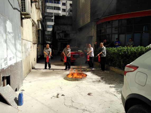 上午09:00酒店職工集合在大廈西區(qū)一側(cè),讓職工使用干粉滅火器對現(xiàn)場小型模擬火點(diǎn)進(jìn)行滅火,親身感受在火場應(yīng)該如何使用正確消防設(shè)備。