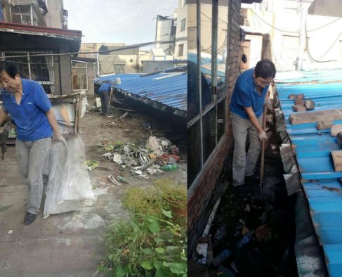 在創(chuàng)衛(wèi)工作中,我公司不僅注重明面的環(huán)境衛(wèi)生治理,更是緊盯環(huán)境衛(wèi)生死角。公司屋頂也是兩幢居民住宅樓中間的平臺(tái),平臺(tái)角落有大量居民亂扔亂放的垃圾。在興隆街社區(qū)的密切配合下,公司和社區(qū)人員共同清理了多年聚積成堆、臭氣熏天的垃圾廢物,把創(chuàng)衛(wèi)活動(dòng)真正落到實(shí)處。