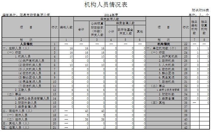 截止2014年末,本單位在職人員16人(其中三人本年轉(zhuǎn)入退休,較上年減少三人),離休人員5人(一人死亡,較上年減少一人),退休人員38人(較上年增加三人)。另外還有一名遺屬(較上年減少一人)。