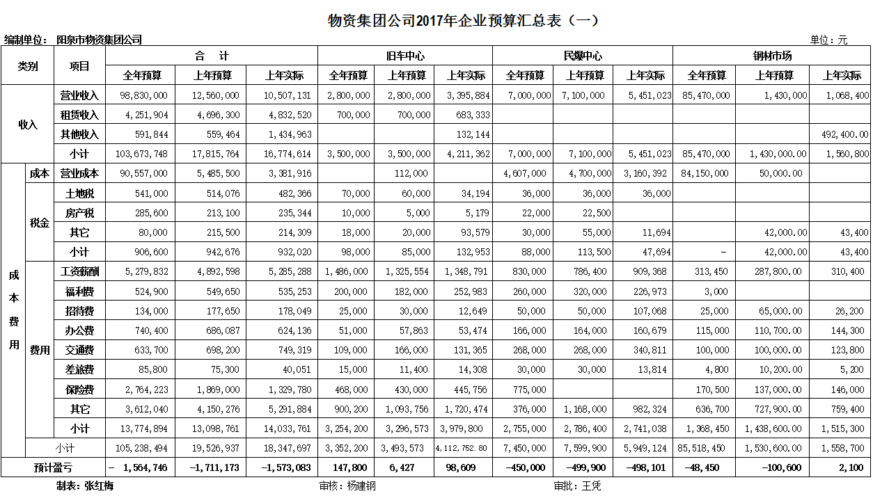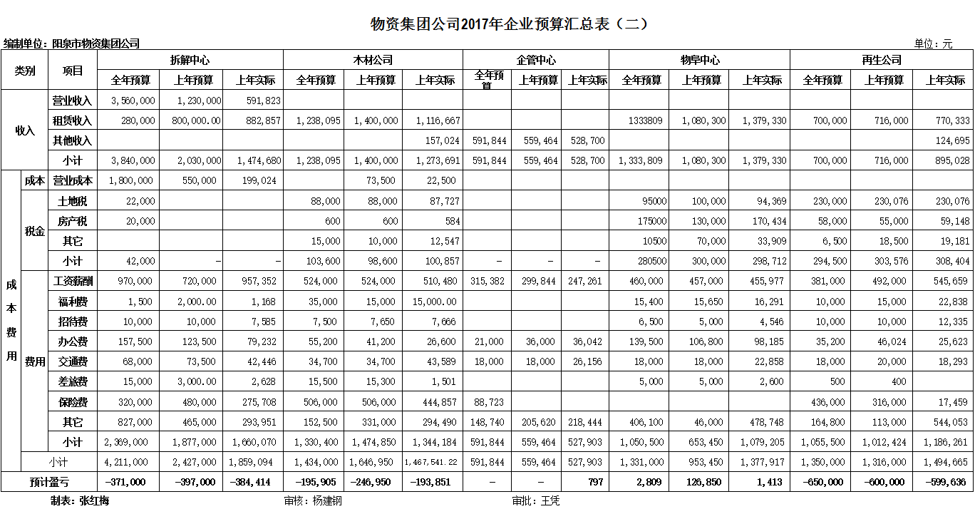 物資集團公司2017年企業(yè)預算匯總表