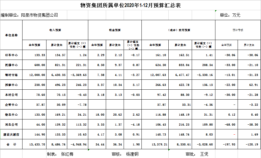 物資集團所屬單位2020年1-12月預(yù)算匯總表