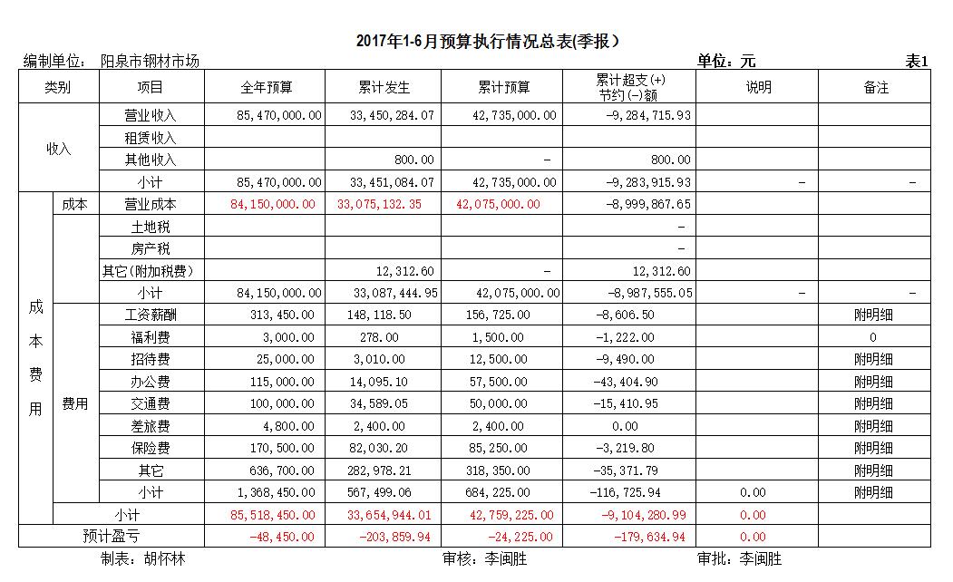 2017年1-6月鋼材市場(chǎng)實(shí)現(xiàn)銷售收入3345.03萬(wàn)元,實(shí)現(xiàn)購(gòu)入3395.51萬(wàn)元,管理費(fèi)用收入37.52萬(wàn)元,管理費(fèi)收入完成年度預(yù)算的 28.42%。費(fèi)用實(shí)際發(fā)生額56.75萬(wàn)元。這是在國(guó)內(nèi)經(jīng)濟(jì)處于底部經(jīng)濟(jì)運(yùn)行狀態(tài)、本地經(jīng)濟(jì)環(huán)境依然處于低迷停滯狀態(tài)下取得的,難能可貴,實(shí)屬不易。就鋼材貿(mào)易市場(chǎng)而言,大宗性鋼材交易少之又少,我市煤炭、耐火磚、基建投資等處于停滯,特別是2016年下半年的稅收營(yíng)改增對(duì)鋼貿(mào)行業(yè)的影響是致命性的沖擊,導(dǎo)致企業(yè)經(jīng)營(yíng)雪上加霜,舉步維艱。就鋼材市場(chǎng)而言,這是擺在當(dāng)前的首要問(wèn)題。就2017年1-6月收入,費(fèi)用等各類經(jīng)濟(jì)數(shù)據(jù)的完成情況公示如下(附詳細(xì)明細(xì)表)。