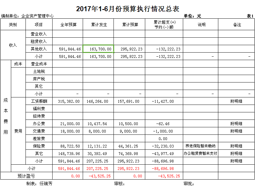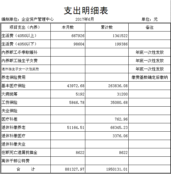 陽(yáng)泉市物資集團(tuán)公司企業(yè)資產(chǎn)管理中心隸屬于陽(yáng)泉市物資集團(tuán)公司,是經(jīng)市國(guó)資委批準(zhǔn)成立的物資集團(tuán)公司七家歇業(yè)關(guān)閉企業(yè)留守機(jī)構(gòu),主要負(fù)責(zé)處理七家歇業(yè)關(guān)閉企業(yè)的相關(guān)事宜,資產(chǎn)管理中心工作人員編制7人。截止目前,我中心共涉及管理原企業(yè)各類人員675人,資金來(lái)源主要依靠財(cái)政撥款,支出主要分為內(nèi)養(yǎng)人員經(jīng)常性費(fèi)用和中心留守人員及機(jī)構(gòu)運(yùn)行費(fèi)用兩部分。2017年財(cái)政核準(zhǔn)收入預(yù)算789.9萬(wàn)元:其中內(nèi)養(yǎng)人員經(jīng)常性費(fèi)用743.3萬(wàn)元,中心留守人員及機(jī)構(gòu)運(yùn)行費(fèi)用46.6萬(wàn)元?,F(xiàn)將上半年預(yù)算執(zhí)行情況及財(cái)務(wù)報(bào)表公示如下: