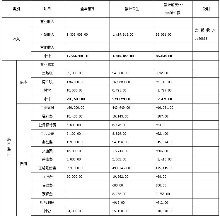 2017年中心以為黨的十九大勝利召開創(chuàng)造穩(wěn)定的安全生產(chǎn)環(huán)境為首要目標(biāo),以安全、效益為中心,穩(wěn)步發(fā)展,善集成器。全年租賃收入預(yù)算140萬元,實(shí)際完成149萬元,完成年計(jì)劃106.43%,上繳稅金34.4萬元,各項(xiàng)費(fèi)用均控制在預(yù)算范圍內(nèi),同時(shí)實(shí)現(xiàn)了安全無事故。
