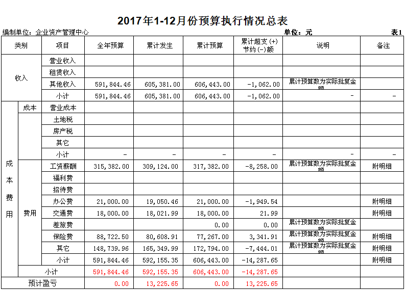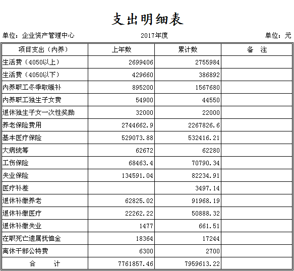 陽(yáng)泉市物資集團(tuán)公司企業(yè)資產(chǎn)管理中心隸屬于陽(yáng)泉市物資集團(tuán)公司,是經(jīng)市國(guó)資委批準(zhǔn)成立的物資集團(tuán)公司七家歇業(yè)關(guān)閉企業(yè)留守機(jī)構(gòu),主要負(fù)責(zé)處理七家歇業(yè)關(guān)閉企業(yè)的相關(guān)事宜,資產(chǎn)管理中心工作人員編制7人。截止2017年末,我中心共涉及管理原企業(yè)各類人員673人,資金來(lái)源主要依靠財(cái)政撥款,支出主要分為內(nèi)養(yǎng)人員經(jīng)常性費(fèi)用和中心留守人員及機(jī)構(gòu)運(yùn)行費(fèi)用兩部分。2017年初財(cái)政收入預(yù)算為789.9萬(wàn)元,年中追加4050以上人員生活費(fèi)增長(zhǎng)額及補(bǔ)發(fā)2016、2017年取暖費(fèi)75.2萬(wàn)元,共計(jì)865.1萬(wàn)元,財(cái)政實(shí)際撥付845.4萬(wàn)元(差額19.7萬(wàn)元為年初預(yù)估社會(huì)保險(xiǎn)繳費(fèi)基數(shù)略高所致,財(cái)政實(shí)際未撥付),財(cái)政撥款支出共計(jì)843.9萬(wàn)元,其中內(nèi)養(yǎng)人員經(jīng)常性費(fèi)用支出796萬(wàn)元,中心留守人員及機(jī)構(gòu)運(yùn)行費(fèi)支出47.9萬(wàn)元,基本維持收支平衡。現(xiàn)將本年預(yù)算執(zhí)行情況及財(cái)務(wù)報(bào)表公示如下: