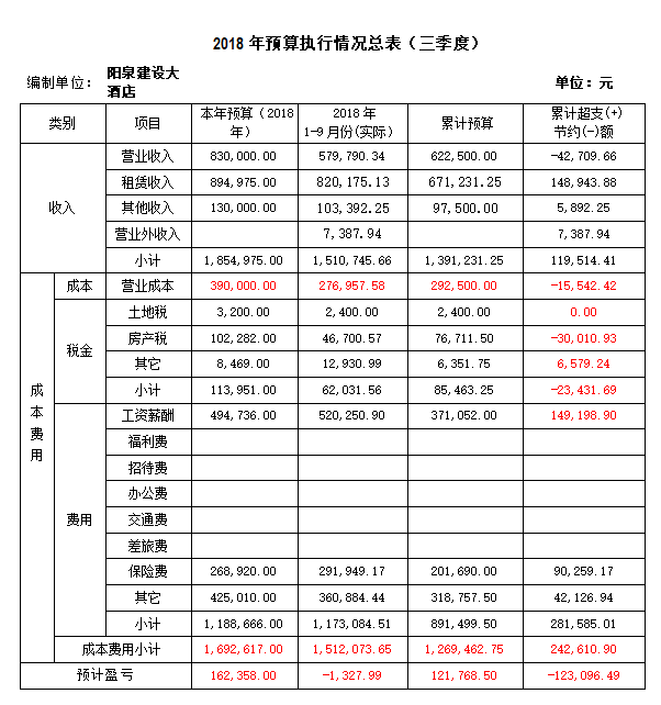 截止9月底,酒店?duì)I業(yè)收入:151.1萬(wàn)元,營(yíng)業(yè)成本:27.7萬(wàn)元,稅金:6.2萬(wàn)元,管理費(fèi)用:117.3萬(wàn)元,營(yíng)業(yè)利潤(rùn):-0.13萬(wàn)元。三季度職工工資按時(shí)發(fā)放,醫(yī)療保險(xiǎn)足額上繳,養(yǎng)老保險(xiǎn)交至2017年11月底。