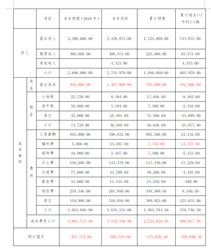 1-9月份,經(jīng)營收入243.9萬元,租賃收入30.8萬元,其他收入0.4萬元;完成年度預算195萬元的41.02%;利潤 -38 萬元,完成年度利潤 -27.5 萬元任務的 38.18 %;發(fā)生費用 313 萬元,完成預算 222 萬元的 40.99 %;在崗人員工資按照不低于2018年陽泉市最低標準按時發(fā)放。