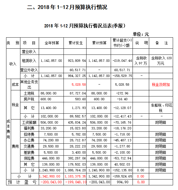 1.收入情況:企業(yè)無主營業(yè)務(wù)收入;1-12月其他業(yè)務(wù)收入92.4萬元(租賃收入),營業(yè)外收入6萬元(國資委困難補助)。2.費用情況:集團公司下達的費用指標為:費用支出合理,保證費用控制在預(yù)算范圍內(nèi),1-12月費用支出118萬元;其中:管理費支出114.1萬元;其他業(yè)務(wù)支出0.5萬元;營業(yè)外支出3.4萬元。3.利潤:集團公司下達的控虧指標為-20萬元,1-12月實際虧損-20萬元。4.職工收入情況:1-12月發(fā)放工資總額43.6萬元。其中:在崗職工工資發(fā)放35萬元(超過最低工資標準),發(fā)放率達100%;其他職工每人每月發(fā)放725–1015元生活費。5.各項保險繳納情況:(1)養(yǎng)老金:1-12月應(yīng)繳29萬元,實繳7.7萬元;(2)失業(yè)金:1–12月應(yīng)繳1.5萬元,實繳1.5萬元;(3)醫(yī)保:按特困企業(yè)標準1–12月應(yīng)繳10.7萬元,實繳 10.7萬元。