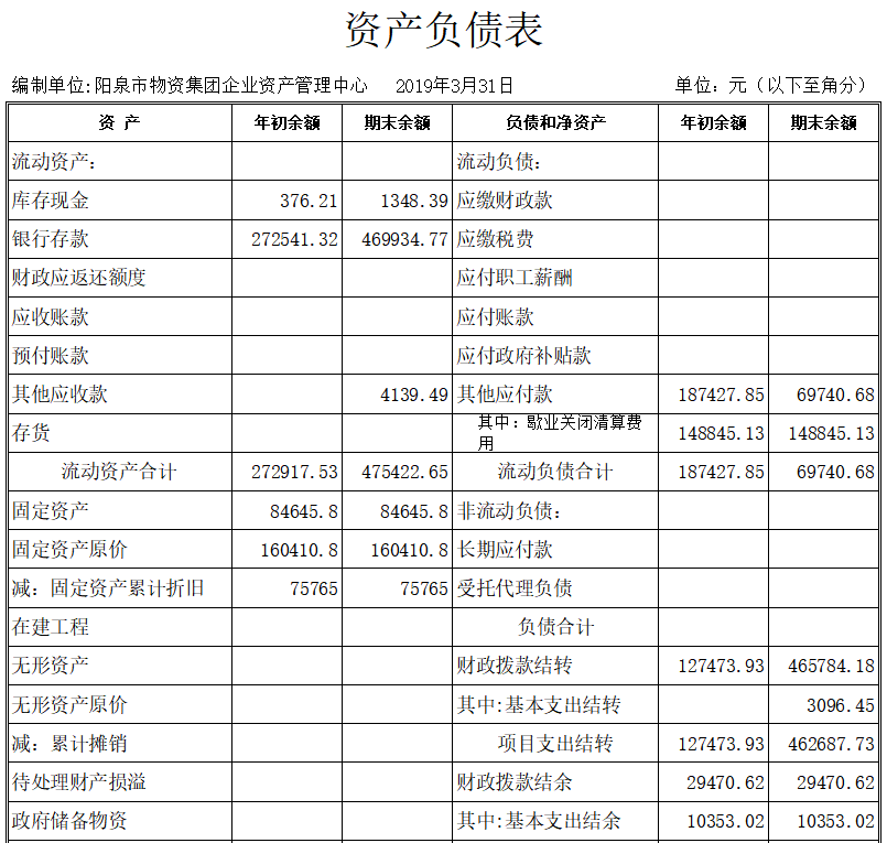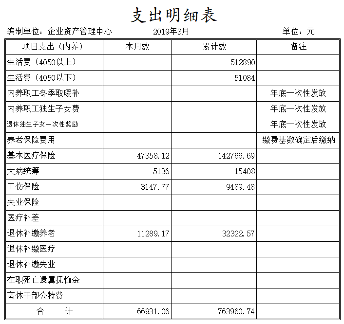 陽泉市物資集團(tuán)公司企業(yè)資產(chǎn)管理中心成立于2014年11月,是物資集團(tuán)公司原化輕總公司等七家歇業(yè)關(guān)閉企業(yè)的留守機構(gòu),隸屬于陽泉市物資集團(tuán)公司。截止3月份底,企業(yè)總?cè)藬?shù)666人,其中在冊職工351人,離退休職工315人。在冊職工按照年齡結(jié)構(gòu)劃分“40、50”以下人員133人,“40、50”以上人員218人。在冊職工生活和社保等費用享受財政補貼。1-3月份發(fā)放內(nèi)養(yǎng)人員生活費51萬元,繳納醫(yī)療保險17萬元,為5名到齡退休人員辦理了退休手續(xù)?,F(xiàn)將一季度財務(wù)狀況及支出情況公示如下: