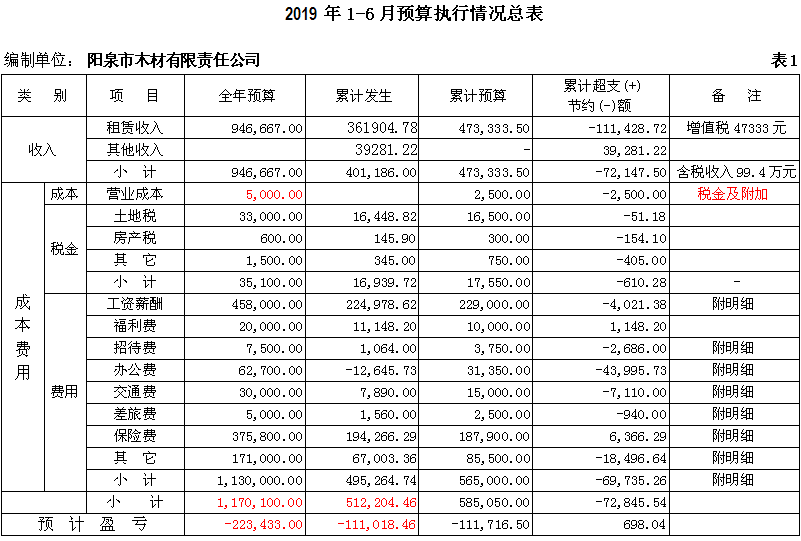 截止6月30日,木材有限責任公司實現(xiàn)租賃收入36.2萬元,完成全年預算的38%,比去年同期56.2萬元減少了20萬元,發(fā)生費用總額51.2萬元,完成全年預算的44%,與去年同期基本相同;利潤-11萬元,完成全年預算-22萬元的50%;1-6月在崗人員按協(xié)商工資足額發(fā)放,“40、50”人員、內(nèi)退人員工資也按月發(fā)放。