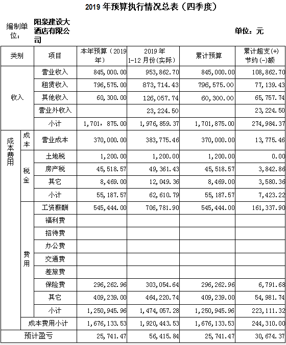 2019年建設(shè)大酒店有限公司營業(yè)收入為195.4萬元,比上年同期減少4%;營業(yè)成本為38.4萬元;稅金及附加為6.3萬元;銷售費(fèi)用為82.3萬元;管理費(fèi)用為65萬元;營業(yè)利潤為3.4萬元。全年職工工資按時(shí)發(fā)放,醫(yī)療保險(xiǎn)足額上繳,養(yǎng)老保險(xiǎn)交至2018年6月底。職工全年平均工資為1630元,比去年同期下降6%。