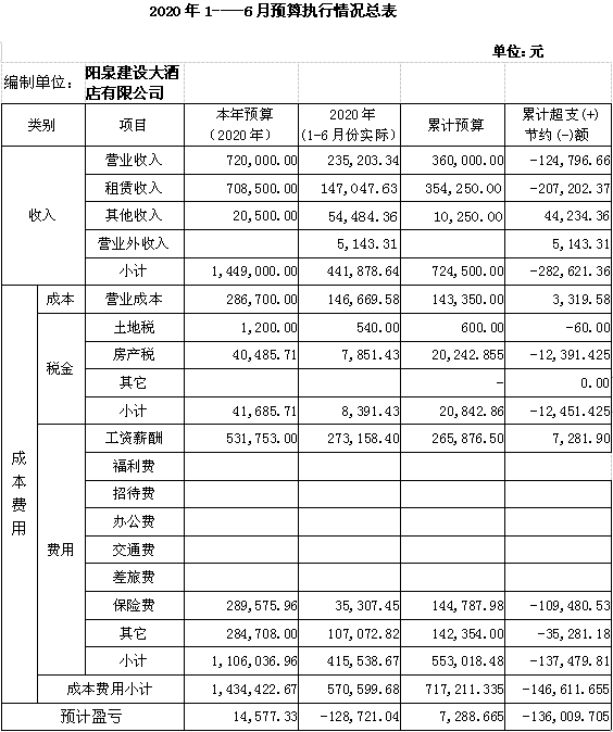 截止6月30日,酒店營業(yè)收入:44.2萬元,營業(yè)成本:14.7萬元,稅金及附加:0.8萬元,銷售費用:23.4萬元,管理費用:18.1萬元,營業(yè)利潤:-12.8萬元。上半年職工工資按時發(fā)放,醫(yī)療保險足額上繳,養(yǎng)老保險交至2018年6月底。