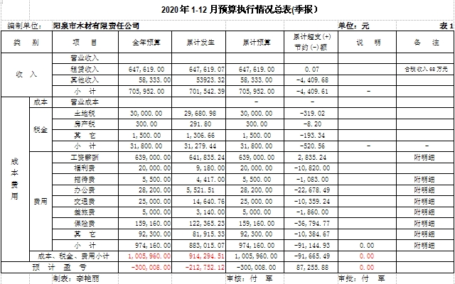 2020年木材有限責任公司實現收入70.1萬元(其中:租賃收入64.7萬元,營業(yè)外收入5.4萬元),完成全年預算70.6萬元的99.3%;發(fā)生費用總額91.4萬元,利潤-21萬元,減虧9萬元;職工醫(yī)療保險金、失業(yè)保險金都如期上繳,為3名達退休年齡職工辦理了退休手續(xù)。