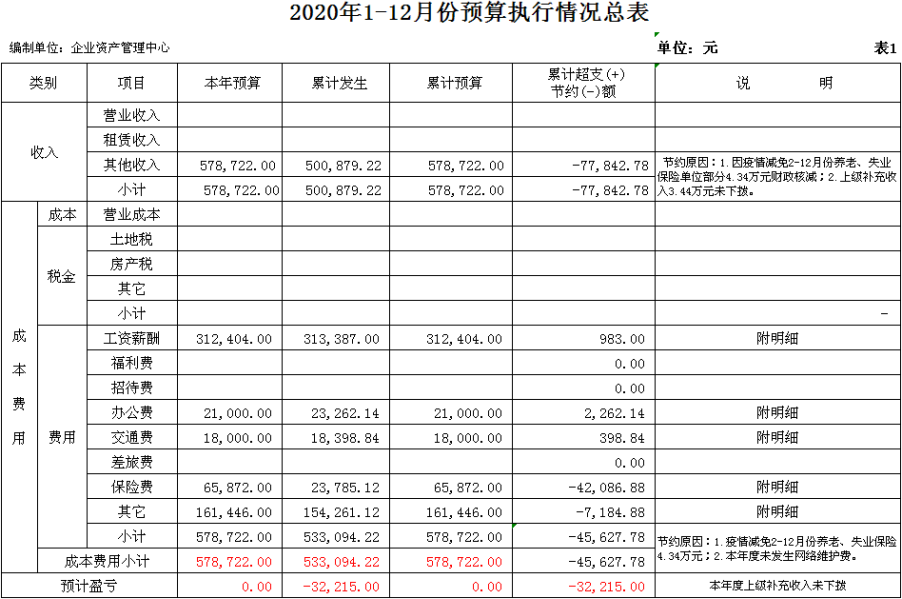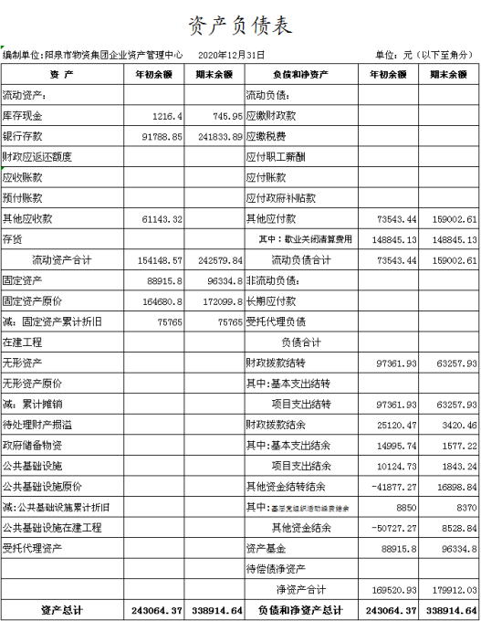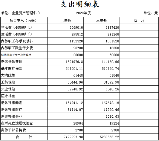 陽泉市物資集團公司企業(yè)資產(chǎn)管理中心成立于2014年11月,是物資集團公司原化輕總公司等七家歇業(yè)關(guān)閉企業(yè)的留守機構(gòu),隸屬于陽泉市物資集團公司,主要負責處理七家歇業(yè)關(guān)閉企業(yè)的相關(guān)事宜。中心工作人員編制7人,資金來源主要依靠財政撥款,支出分為內(nèi)養(yǎng)人員經(jīng)常性費用和中心留守人員及機構(gòu)運行費用兩部分。截止2020年12月底,企業(yè)總?cè)藬?shù)657人,其中在冊職工310人,離退休職工347人。在冊職工按照年齡結(jié)構(gòu)劃分“40、50”以下人員113人,“40、50”以上人員197人,在冊職工生活和社保等費用享受財政補貼。2020年財政撥款收入年初預算為749.52萬元,年中因受疫情影響減免養(yǎng)老、失業(yè)保險單位部分等核減176.4萬元,全年財政撥款收入共計573.12萬元,財政撥款支出573.12萬元,其中:內(nèi)養(yǎng)人員經(jīng)常性費用523.03萬元,中心留守人員及機構(gòu)運行費用50.09萬元,收支平衡。全年累計為職工發(fā)放生活費315萬元,繳納社會保險95萬元,為33名到齡職工辦理了退休手續(xù)。現(xiàn)將本年度預算執(zhí)行情況及財務狀況公示如下: