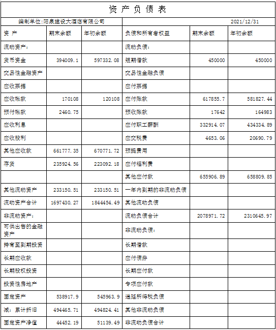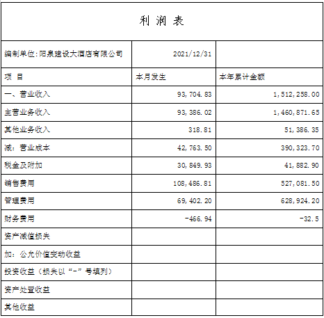 2021年酒店?duì)I業(yè)收入為151.23萬(wàn)元;營(yíng)業(yè)成本為39.03萬(wàn)元;稅金及附加為4.19萬(wàn)元;銷售費(fèi)用為52.71萬(wàn)元;管理費(fèi)用為62.89萬(wàn)元;營(yíng)業(yè)利潤(rùn)為-7.59萬(wàn)元;營(yíng)業(yè)外收入為11.10萬(wàn)元;營(yíng)業(yè)外支出0.83萬(wàn)元;利潤(rùn)總額為2.68萬(wàn)元;所得稅費(fèi)用為0.27萬(wàn)元;凈利潤(rùn)為2.41萬(wàn)元。