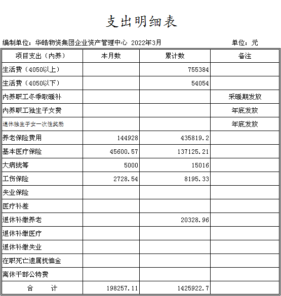 陽泉市物資集團(tuán)公司企業(yè)資產(chǎn)管理中心成立于2014年11月,是物資集團(tuán)公司原化輕總公司等七家歇業(yè)關(guān)閉企業(yè)的留守機(jī)構(gòu),隸屬于陽泉市華皓物資集團(tuán)有限責(zé)任公司。截止3月份底,企業(yè)總?cè)藬?shù)648人,其中在冊(cè)職工293人,離退休職工355人。在冊(cè)職工按照年齡結(jié)構(gòu)劃分“40、50”以下人員93人,“40、50”以上人員200人。在冊(cè)職工生活和社保等費(fèi)用享受財(cái)政補(bǔ)貼。1-3月份發(fā)放內(nèi)養(yǎng)人員生活費(fèi)80.94萬元,繳納養(yǎng)老保險(xiǎn)45.61萬元,繳納醫(yī)療保險(xiǎn)16.03萬元,為3名到齡退休人員辦理了退休手續(xù)?,F(xiàn)將上半年財(cái)務(wù)狀況及支出情況公示如下: