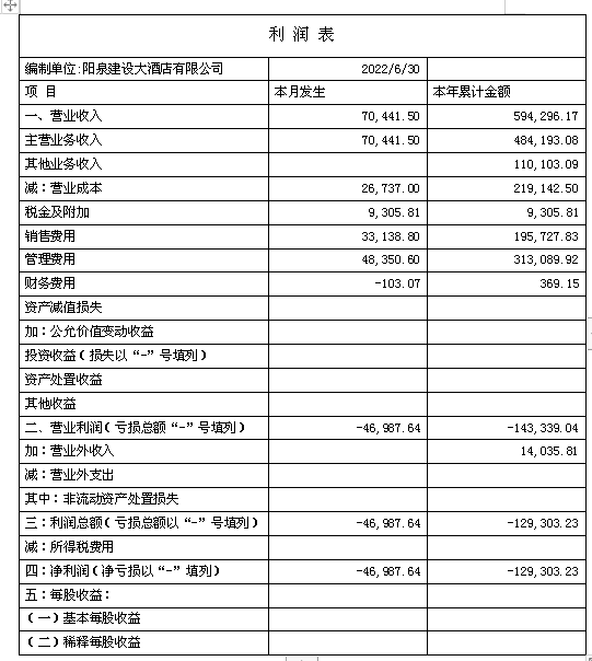 2022年1-6月份,酒店?duì)I業(yè)收入為59.43萬(wàn)元,營(yíng)業(yè)成本為21.91萬(wàn)元,稅金及附加0.93萬(wàn)元,銷(xiāo)售費(fèi)用為19.57萬(wàn)元,管理費(fèi)用為31.31萬(wàn)元,財(cái)務(wù)費(fèi)用為0.04萬(wàn)元,營(yíng)業(yè)利潤(rùn)為-14.33萬(wàn)元,營(yíng)業(yè)外收入為1.40萬(wàn)元,利潤(rùn)總額為-12.93萬(wàn)元,凈利潤(rùn)為-12.93萬(wàn)元。