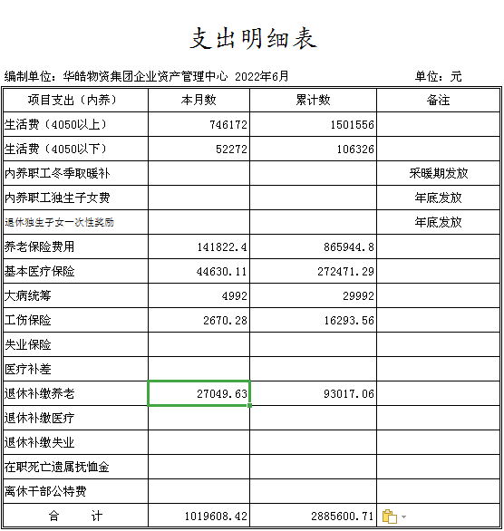 陽泉市物資集團(tuán)公司企業(yè)資產(chǎn)管理中心成立于2014年11月,是物資集團(tuán)公司原化輕總公司等七家歇業(yè)關(guān)閉企業(yè)的留守機(jī)構(gòu),隸屬于陽泉市華皓物資集團(tuán)有限責(zé)任公司。截止6月份底,企業(yè)總?cè)藬?shù)648人,其中在冊(cè)職工287人,離退休職工361人。在冊(cè)職工按照年齡結(jié)構(gòu)劃分“40、50”以下人員91人,“40、50”以上人員196人。在冊(cè)職工生活和社保等費(fèi)用享受財(cái)政補(bǔ)貼。1-6月份發(fā)放內(nèi)養(yǎng)人員生活費(fèi)160.8萬元,繳納養(yǎng)老保險(xiǎn)95.9萬元,繳納醫(yī)療保險(xiǎn)31.9萬元,為9名到齡退休人員辦理了退休手續(xù)?,F(xiàn)將上半年財(cái)務(wù)狀況及支出情況公示如下: